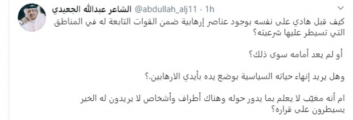 وقال في تغريدة عبر "تويتر" رصدها "المشهد العربي": "كيف قبل هادي على نفسه بوجود عناصر إرهابية ضمن القوات التابعة له في المناطق التي تسيطر عليها شرعيته؟ أو لم يعد أمامه سوى ذلك؟".