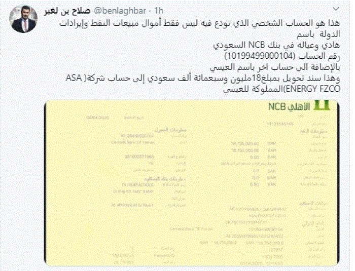 وقال في تغريدة عبر "تويتر" رصدها "المشهد العربي": "هذا هو الحساب الشخصي الذي تودع فيه ليس فقط أموال مبيعات النفط وإيرادات الدولة باسم هادي وعياله في بنك NCB السعودي رقم الحساب (10199499000104)".