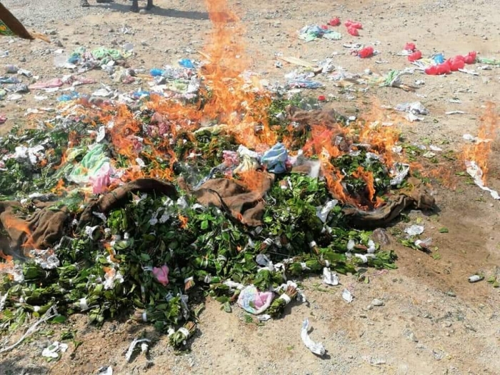 أتلفت قوات خفر سواحل حضرموت، اليوم الاثنين، 700 بندل قات في مقر قيادة خفر السواحل، بالمكلا، بعد ضبطها في محاولة تهريب قات عبر ساحل حصيحصة، في مديرية بروم ميفع.