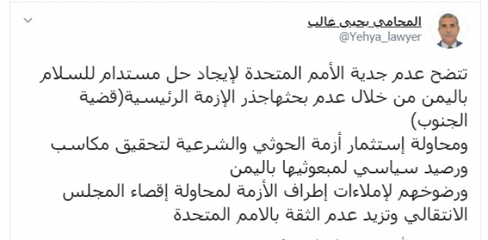 وكتب غالب عبر تغريدة له على "تويتر" رصدها "المشهد العربي":"تتضح عدم جدية الأمم المتحدة لإيجاد حل مستدام للسلام باليمن من خلال عدم بحثها جذور الأزمة الرئيسية(قضية الجنوب)".