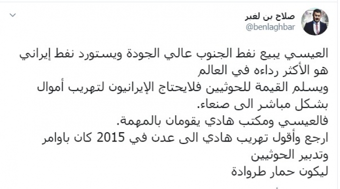 وكتب بن لغبر عبر تغريدة له على "تويتر" رصدها " المشهد العربي":"العيسي يبيع نفط الجنوب عالي الجودة ويستورد نفط إيراني هو الأكثر رداءة في العالم".
