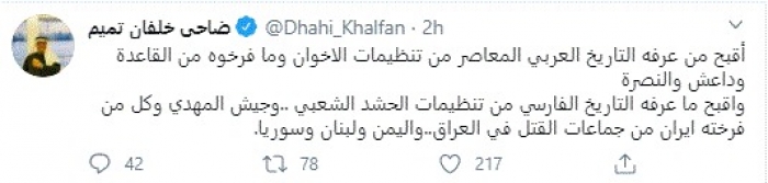 وقال في تغريدة عبر "تويتر" رصدها "المشهد العربي": "أقبح من عرفه التاريخ العربي المعاصر من تنظيمات الإخوان وما فرخوه من القاعدة وداعش والنصرة وأقبح ما عرفه التاريخ الفارسي من تنظيمات الحشد الشعبي.. وجيش المهدي وكل من فرخته إيران من جماعات القتل في العراق..واليمن ولبنان وسوريا".