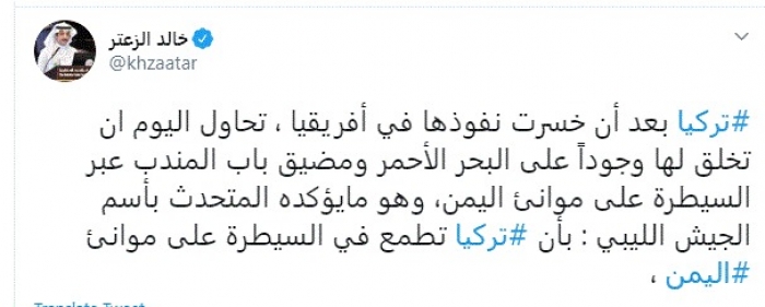 وقال في تغريدة عبر "تويتر" رصدها "المشهد العربي": "تركيا بعد أن خسرت نفوذها في أفريقيا ، تحاول اليوم أن تخلق لها وجوداً على البحر الأحمر ومضيق باب المندب عبر السيطرة على موانئ اليمن، وهو مايؤكده المتحدث بأسم الجيش الليبي: بأن تركيا تطمع في السيطرة على موانئ اليمن".