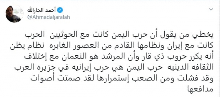 وكتب في تغريدة عبر "تويتر" رصدها "المشهد العربي": "يخطئ من يقول أن حرب اليمن كانت مع الحوثيين الحرب كانت مع إيران ونظامها القادم من العصور الغابرة".