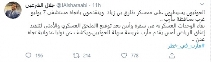 وقال في تغريدة عبر "تويتر" رصدها "المشهد العربي": "الحوثيون يسيطرون على معسكر طارق بن زياد ويتقدمون باتجاه مستشفى 7 يوليو غرب محافظة مأرب.. بقاء الوحدات العسكرية في شقرة وأبين بعد توقيع الملحق العسكري والأمني لتنفيذ اتفاق الرياض أمس يقدم مأرب فريسة سهلة للحوثيين، ويكشف عن نوايا عدوانية تجاه عدن".