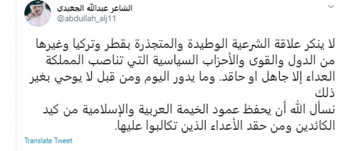 وقال في تغريدة عبر "تويتر" رصدها "المشهد العربي": "لا ينكر علاقة الشرعية الوطيدة والمتجذرة بقطر وتركيا وغيرها من الدول والقوى والأحزاب السياسية التي تناصب المملكة العداء إلا جاهل أو حاقد. وما يدور اليوم ومن قبل لا يوحي بغير ذلك".