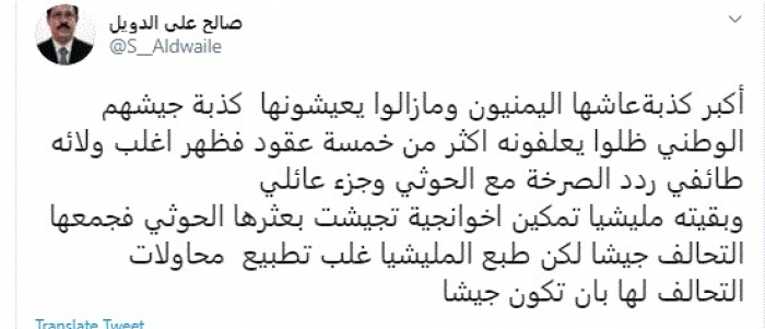 وقال في تغريدة عبر "تويتر" رصدها "المشهد العربي": "أكبر كذبة عاشها اليمنيون وما زالوا يعيشونها كذبة جيشهم الوطني ظلوا يعلفونه أكثر من خمسة عقود فظهر أغلب ولائه طائفي ردد الصرخة مع الحوثي".