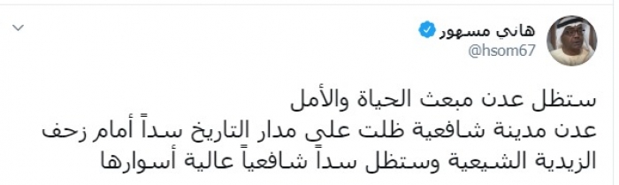 وكتب مسهور عبر اغريدة له على "تويتر" رصدها " المشهد العربي":"ستظل عدن مبعث الحياة والأمل ".