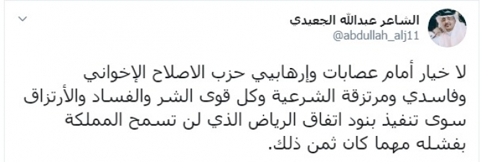 وكتب الجعيدي عبر تغريدة له على "تويتر" رصدها " المشهد العربي":"لا خيار أمام عصابات وإرهابيي حزب الإصلاح الإخواني وفاسدي ومرتزقة الشرعية وكل قوى الشر والفساد والأرتزاق سوى تنفيذ بنود اتفاق الرياض الذي لن تسمح المملكة بفشله مهما كان ثمن ذلك".