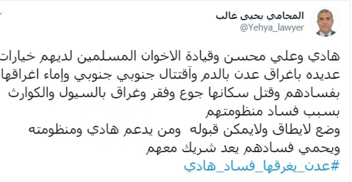 وكتب غالب عبر تغريدة له على "تويتر" رصدها " المشهد العربي":"هادي وعلي محسن وقيادة الإخوان المسلمين لديهم خيارات عديدة بإغراق عدن بالدم واقتتال جنوبي جنوبي وإما إغراقها بفسادهم وقتل سكانها جوع وفقر وغرق بالسيول والكوارث بسبب فساد منظومتهم".