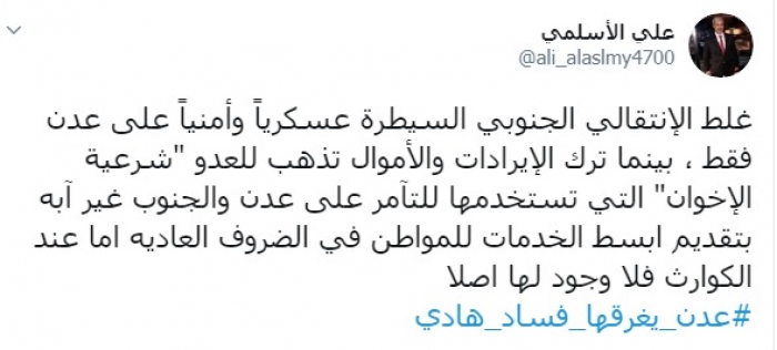 وكتب الأسلمي عبر تغريدة له على "تويتر" رصدها " المشهد العربي":"غلط الانتقالي الجنوبي السيطرة عسكرياً وأمنياً على عدن فقط ، بينما ترك الإيرادات والأموال تذهب للعدو "شرعية الإخوان" التي تستخدمها للتآمر على عدن والجنوب".