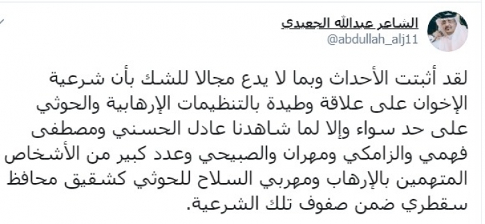 أكد الشاعر عبد الله الجعيدي، اليوم الثلاثاء، أن مليشيا الإخوان الإرهابية التابعة للشرعية على علاقة وثيقة بالتنظيمات الإرهابية ومليشيا الحوثي.
