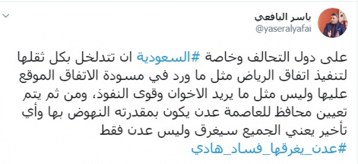 وكتب اليافعي عبر تغريدة له على "تويتر" رصدها " المشهد العربي":"على دول التحالف وخاصة السعودية أن تتدخل بكل ثقلها لتنفيذ اتفاق الرياض مثل ما ورد في مسودة الاتفاق الموقع عليها وليس مثل ما يريد الإخوان وقوى النفوذ".