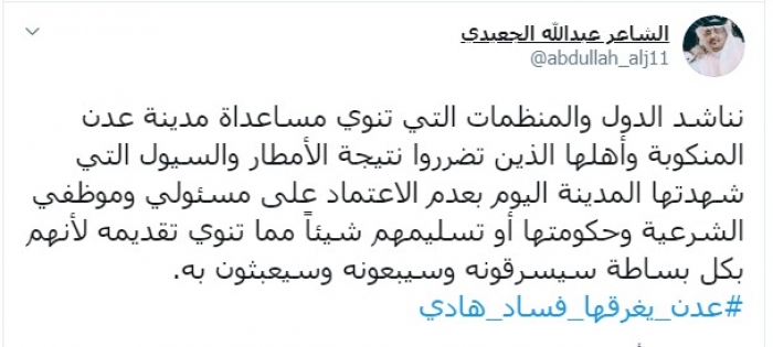 وكتب الجعيدي عبر تغريدة له على "تويتر" رصدها " المشهد العربي":"نناشد الدول والمنظمات التي تنوي مساعدة مدينة عدن المنكوبة وأهلها الذين تضرروا نتيجة الأمطار والسيول التي شهدتها المدينة اليوم بعدم الاعتماد على مسئولي وموظفي الشرعية وحكومتها أو تسليمهم شيئاً مما تنوي تقديمه لأنهم بكل بساطة سيسرقونه وسيبعونه وسيعبثون به.