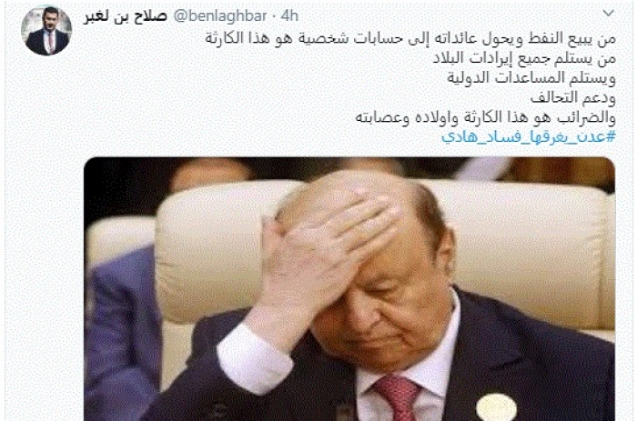 شن الإعلامي صلاح بن لغبر، اليوم، هجومًا حادًا على الرئيس اليمني المؤقت عبدربه منصور هادي، متهمًا إياه بنهب ثروات وموارد اليمن والمساعدات الدولية.