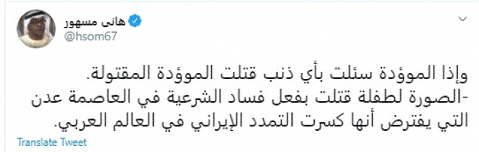 وقال في تغريدة عبر "تويتر" رصدها "المشهد العربي": "وإذا الموؤدة سئلت بأي ذنب قتلت الموؤدة المقتولة. الصورة لطفلة قتلت بفعل فساد الشرعية في العاصمة عدن التي يفترض أنها كسرت التمدد الإيراني في العالم العربي".