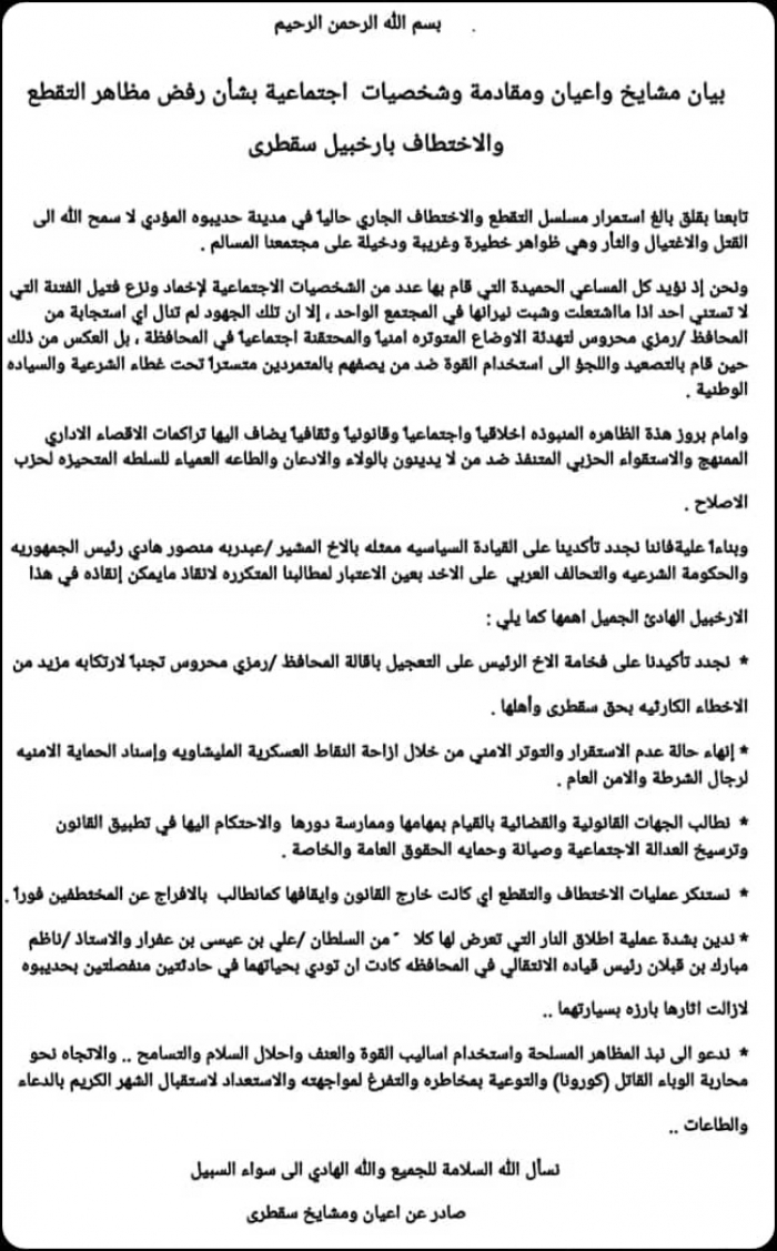 مشائخ سقطرى يرفعون عدة توصيات لإنهاء الإرهاب الإخواني