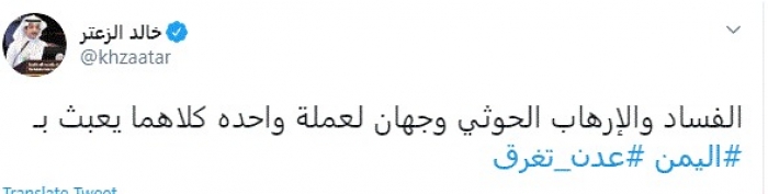 وكتب في تغريدة عبر "تويتر" رصدها "المشهد العربي": "الفساد والإرهاب الحوثي وجهان لعملة واحده كلاهما يعبث باليمن".