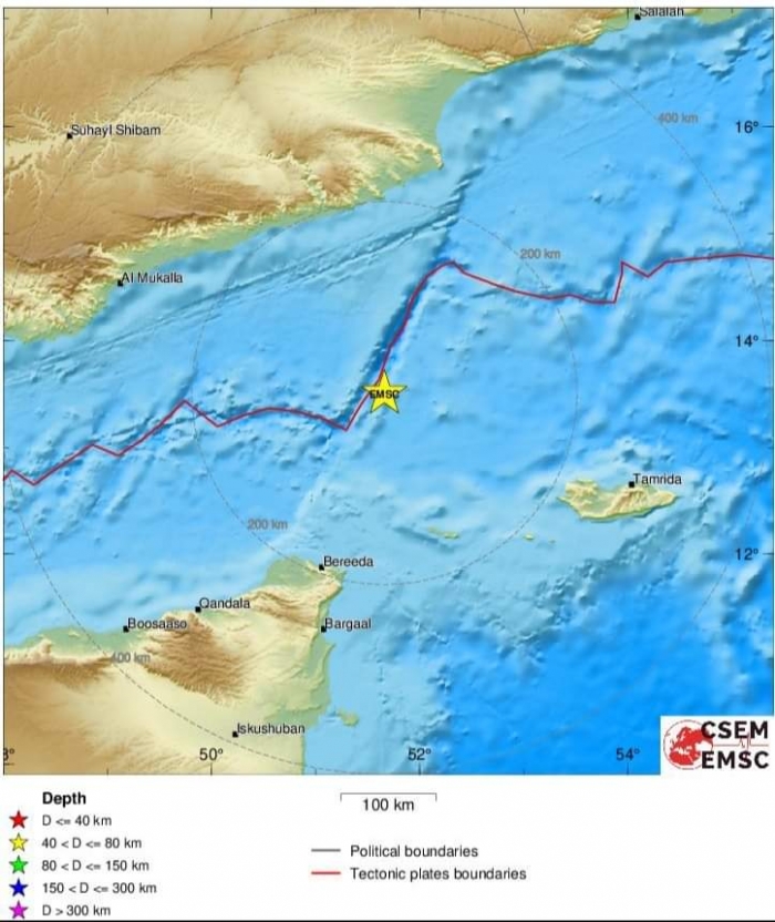 أكدت جهات الأرصاد أن محطات الرصد الزلزالي الإقليمية رصدت هزة زلزالية وسط خليج عدن قبالة سواحل محافظتي المهرة وحضرموت الساعة 11:22 مساء الأربعاء، بقوة 5.1 درجات على مقياس ريختر (متوسط الشدة).