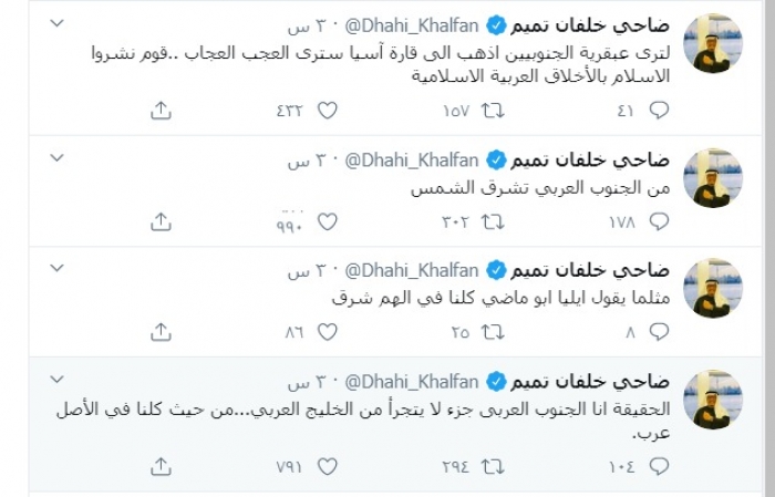وكتب خلفان عبر تغريدة له على "تويتر" رصدها " المشهد العربي":"الحقيقة أن الجنوب العربي جزء لا يتجرأ من الخليج العرب،من حيث كلنا في الأصل عرب".
