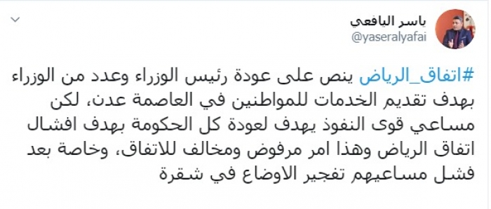 وكتب اليافعي عبر تغريدة له على "تويتر" رصدها " المشهد العربي":"اتفاق الرياض ينص على عودة رئيس الوزراء وعدد من الوزراء بهدف تقديم الخدمات للمواطنين في العاصمة عدن".