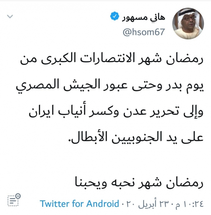 وكتب "مسهور" في تغريدة عبر حسابه الشخصي بتويتر، رصدها "المشهد العربي" : "رمضان شهر الانتصارات الكبرى من يوم بدر وحتى عبور الجيش المصري وإلى تحرير عدن وكسر أنياب إيران على يد الجنوبيين الأبطال" .