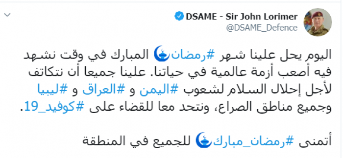 وكتب لوريمر عبر تغريدة له على "تويتر" رصدها " المشهد العربي":"اليوم يحل علينا شهر رمضان المبارك في وقت نشهد فيه أصعب أزمة عالمية في حياتنا".