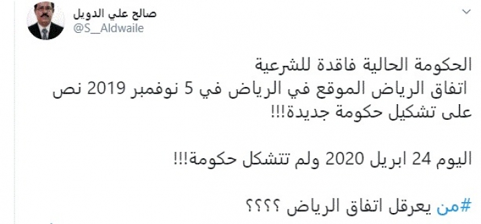 وكتب في تغريدة عبر "تويتر" رصدها "المشهد العربي": "الحكومة الحالية فاقدة للشرعية اتفاق الرياض الموقع في الرياض في 5 نوفمبر 2019 نص على تشكيل حكومة جديدة".