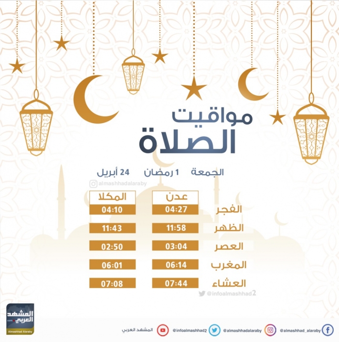 ينشر "المشهد العربي" موعد الإفطار وأذان المغرب فى اليوم الأول من شهر رمضان المبارك، بالعاصمة عدن ومدينة المكلا.
