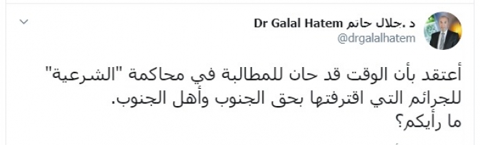 وكتب حاتم عبر تغريدة له على "تويتر" رصدها " المشهد العربي":"أعتقد بأن الوقت قد حان للمطالبة في محاكمة "الشرعية" للجرائم التي اقترفتها بحق الجنوب وأهل الجنوب، ما رأيكم؟".