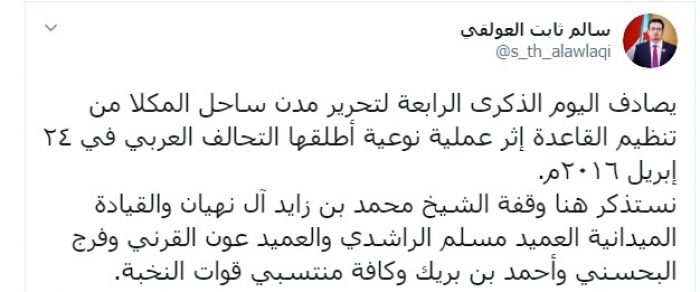 وكتب العولقي عبر تغريدة له على "تويتر" رصدها " المشهد العربي":"يصادف اليوم الذكرى الرابعة لتحرير مدن ساحل المكلا من تنظيم القاعدة إثر عملية نوعية أطلقها التحالف العربي في 24 إبريل 2016م".