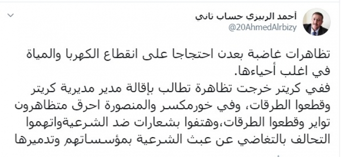 وكتب الربيزي عبر تغريدة له على "تويتر" رصدها " المشهد العربي":"تظاهرات غاضبة بعدن احتجاجا على انقطاع الكهربا والمياه في اغلب أحياءها".
