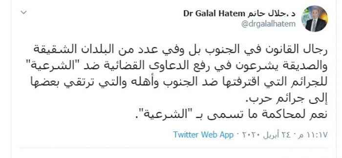 وكتب عبر تغريدة له على "تويتر" رصدها " المشهد العربي":"رجال القانون في الجنوب بل وفي عدد من البلدان الشقيقة والصديقة يشرعون في رفع الدعاوى القضائية ضد "الشرعية" للجرائم التي اقترفتها ضد الجنوب وأهله والتي ترتقي بعضها إلى جرائم حرب".