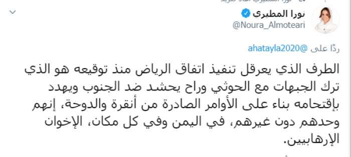 وكتبت المطيري عبر تغريدة لها على "تويتر" رصدها " المشهد العربي":"الطرف الذي يعرقل تنفيذ اتفاق الرياض منذ توقيعه هو الذي ترك الجبهات مع الحوثي وراح يحشد ضد الجنوب ويهدد باقتحامه بناء على الأوامر الصادرة من أنقرة والدوحة".
