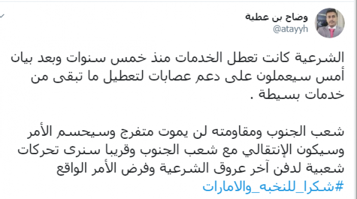 وكتب بن عطية عبر تغريدة له على "تويتر" رصدها " المشهد العربي":"الشرعية كانت تعطل الخدمات منذ خمس سنوات وبعد بيان أمس سيعملون على دعم عصابات لتعطيل ما تبقى من خدمات بسيطة".