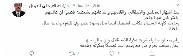 وقال في تغريدة عبر "تويتر" رصدها "المشهد العربي": "منذ إشهار المجلس الانتقالي وأقلامهم وإشاعاتهم تشيطنه فظنوا أن عالمهم الافتراضي هو الواقع وجاءت كارثة السيول فكانت استفتاء أينما يحل وجود تصويري للشرخوانجية ينال اللعنات".