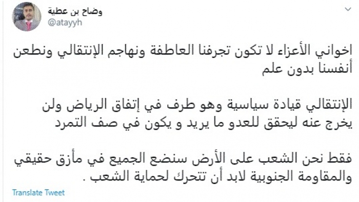 وقال في تغريدة عبر "تويتر" رصدها "المشهد العربي": "إخواني الأعزاء لا تكون تجرفنا العاطفة ونهاجم الانتقالي ونطعن أنفسنا بدون علم.. الانتقالي قيادة سياسية وهو طرف في اتفاق الرياض ولن يخرج عنه ليحقق للعدو ما يريد ويكون في صف التمرد".