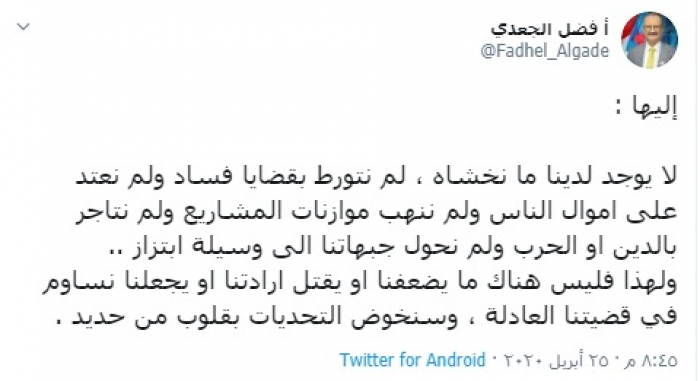 وكتب "الجعدي" تغريدة عبر حسابه بتويتر، رصدها "المشهد العربي" قال فيها:"لا يوجد لدينا ما نخشاه ، لم نتورط بقضايا فساد ولم نعتد على أموال الناس ولم ننهب موازنات المشاريع ولم نتاجر بالدين أو الحرب ولم نحول جبهاتنا إلى وسيلة ابتزاز"..