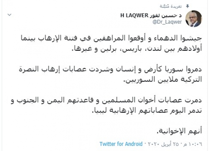 وكتب "لقور" في تغريدة عبر حسابه الشخصي بتويتر، رصدها "المشهد العربي" قال فيها: