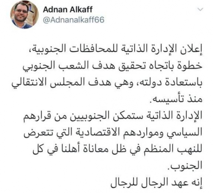 شدد عضو هيئة رئاسة المجلس الانتقالي الجنوبي، عدنان الكاف، أن إعلان الإدارة الذاتية للجنوب خطوة لاستعادة الدولة.