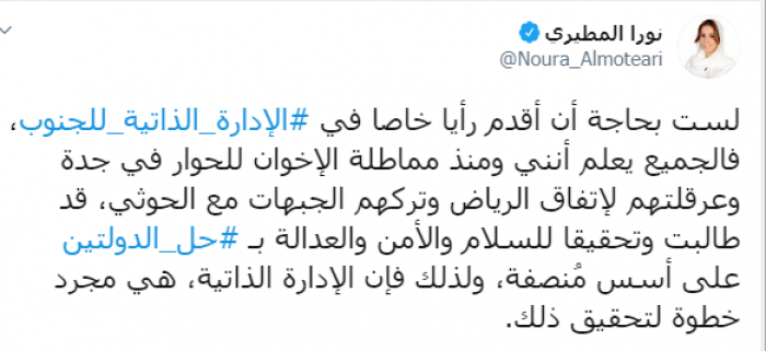 وكتبت المطيري عبر تغريدة لها على "تويتر" رصدها " المشهد العربي":"لست بحاجة أن أقدم رأيا خاصا في الإدارة الذاتية للجنوب، فالجميع يعلم أنني ومنذ مماطلة الإخوان للحوار في جدة وعرقلتهم لاتفاق الرياض وتركهم الجبهات مع الحوثي، قد طالبت وتحقيقا للسلام والأمن والعدالة بـحل الدولتين على أسس مُنصفة".