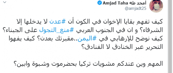 وأضاف:"كيف نوضح للإرهابي في اليمن،مقبرتك بعدن؟ كيف يفهموا التحرير عبر الخنادق لا الفنادق؟ المهم وين عندكم مشويات تركيا بحضرموت وشبوة وأبين؟".
