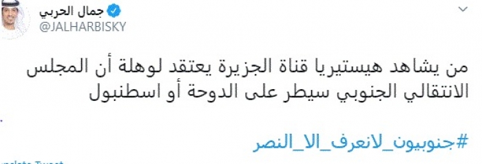 وقال في تغريدة عبر "تويتر" رصدها "المشهد العربي": "من يشاهد هيستيريا قناة الجزيرة يعتقد لوهلة أن المجلس الانتقالي الجنوبي سيطر على الدوحة أو إسطنبول".