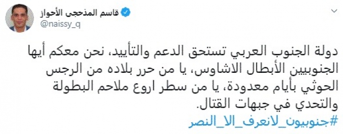 وقال في تغريدة عبر "تويتر" رصدها "المشهد العربي": "دولة الجنوب العربي تستحق الدعم والتأييد، نحن معكم أيها الجنوبيين الأبطال الاشاوس، يا من حرر بلاده من الرجس الحوثي بأيام معدودة، يا من سطر اروع ملاحم البطولة والتحدي في جبهات القتال".
