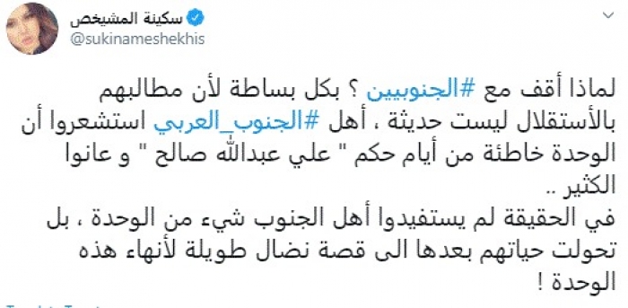 وقالت في تغريدة عبر "تويتر" رصدها "المشهد العربي": "لماذا أقف مع الجنوبيين؟ بكل بساطة لأن مطالبهم بالاستقلال ليست حديثة، أهل الجنوب العربي استشعروا أن الوحدة خاطئة من أيام حكم علي عبدالله صالح وعانوا الكثير".
