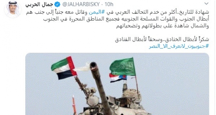 وقال في تغريدة عبر "تويتر" رصدها "المشهد العربي": "شهادة للتاريخ..أكثر من خدم التحالف العربي في اليمن وقاتل معه جنباً إلى جنب هم أبطال الجنوب والقوات المسلحة الجنوبية فجميع المناطق المحررة في الجنوب والشمال شاهدة على بطولاتهم وتضحياتهم شكراً لأبطال الخنادق..وسحقاً لأبطال الفنادق".