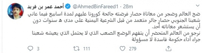 وقال في تغريدة عبر "تويتر" رصدها "المشهد العربي": "ضج العالم وضجر من معاناة حصار فرضته جائحة كورونا عليهم لمدة أسابيع فيما عانى شعبنا الجنوبي حصار جائر متعمد من قبل الشرعية اليمنية على مدى 5 سنوات دون أن يستشعر معاناته أحد".