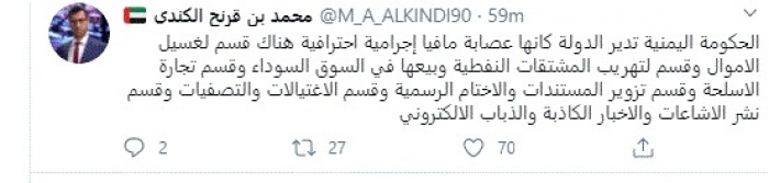وقال في تغريدة عبر "تويتر" رصدها "المشهد العربي": "الحكومة اليمنية تدير الدولة كأنها عصابة مافيا إجرامية احترافية هناك قسم لغسيل الأموال وقسم لتهريب المشتقات النفطية وبيعها في السوق السوداء وقسم تجارة الأسلحة وقسم تزوير المستندات والأختام الرسمية وقسم الاغتيالات والتصفيات وقسم نشر الاشاعات والأخبار الكاذبة والذباب الإلكتروني".
