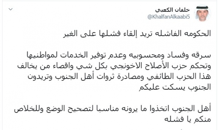 وكتب الكعبي عبر تغريدة له على "تويتر" رصدها " المشهد العربي":"الحكومة الفاشلة تريد إلقاء فشلها على الغير".