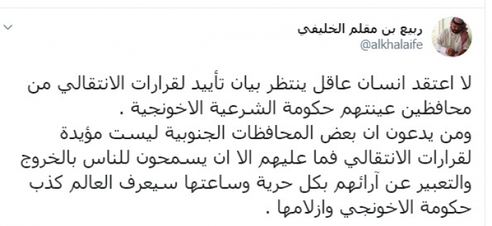 وكتب الخليفي عبر تغريدة له على "تويتر" رصدها " المشهد العربي":"لا اعتقد إنسان عاقل ينتظر بيان تأييد لقرارات الانتقالي من محافظين عينتهم حكومة الشرعية الإخونجية" .
